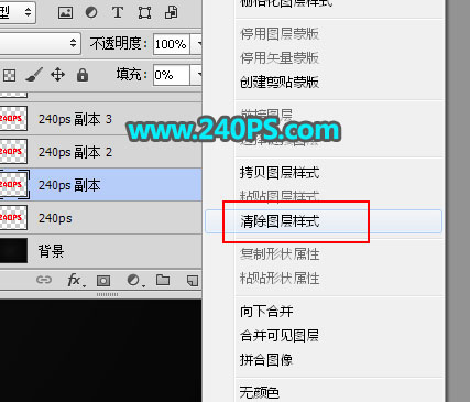 8、按Ctrl + J 把当前文字图层复制一层,得到文字副本图层,如下图。然后在文字缩略图后面的蓝色区域鼠标右键,选择“清除图层样式”,过程如下图。