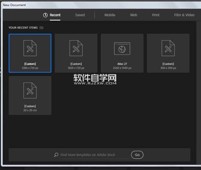 第1步、打开AICC2019软件,点击新建文档,点击1280x720PX,点击确定。