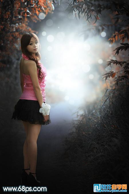 | 1、打开原图素材大图,新建一个图层,用透明度为10%的柔边黑色画笔把下图红圈部分涂暗一点。 |
