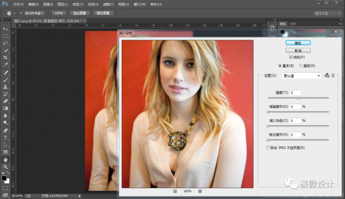 在“背景图层 拷贝”图层,点击选择:滤镜 >杂色 >减少杂色,设置(降噪模式:基本、设置:默认值、强度:5、保留细节:0%、减少杂色:0%、锐化细节:0%、把‘移去JPEG不自然感’的勾去掉),好了后点击‘确定’;接着按几下Ctrl+F重复几次减少杂色的步骤