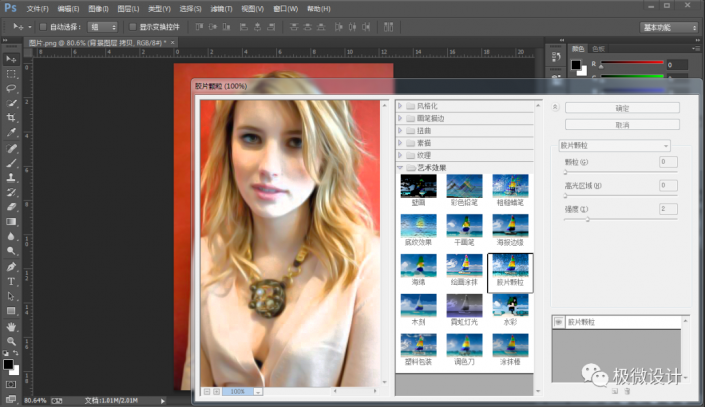 在“背景图层 拷贝”图层,点击选择:滤镜 >滤镜库,设置(艺术效果>胶片颗粒,颗粒:0、高光区域:0、强度:2),好了后点击‘确定’