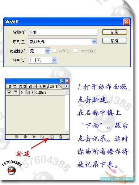 Photoshop给人物照加上暴雨动画 日期:2025-11-04 13:05:33 栏目:软件教程 浏览:3 评论:0 最终效果 1、打开原图素材,点动作面板,点面板下面的新建按钮新建一个动作,名称自定。再点击记录按钮,这是你的所有操作将被记录下来。 上一篇:禁止图形放置的位置随意变动 下一篇:巧用Photoshop计算工具给人像祛斑及磨皮教程 相关推荐 win11安卓子系统安装部署失败0X80073CF3怎么解决?详情 chatgpt通过图灵测试 ai导出图片jpg太模糊怎么办 AI怎么设计Yahoo的APP图标教程 评论留言 我要留言 ◎欢迎参与讨论,请在这里发表您的看法、交流您的观点。 昵称:* 邮箱:* 网址: 内容: 取消回复