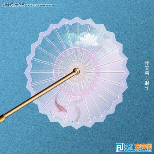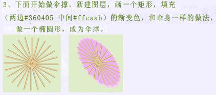 | 3、下面开始做伞撑。新建一个图层,用矩形选框工具拉一个矩形,填充线性渐变色,颜色设置为两边颜色:#360405,中间颜色:#ffeaab。然后再复制方法同上做成一个椭圆形,效果如下图。 |