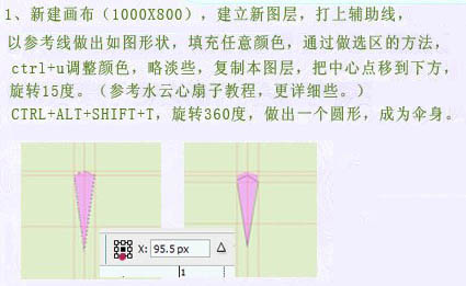 | 1、新建一个1000 * 800像素的文档,新建一个图层打上辅助线。以参考线做出下图所示的形状,填充任意颜色。按Ctrl + J 把本图层复制一层,按Ctrl + T 把中心点移到下方,角度设置为15度,然后按Ctrl + Alt + Shift + T 复制做出一个圆形。 |
