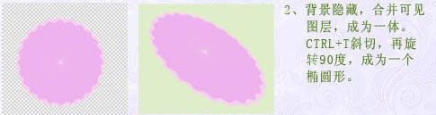 | 2、本背景图层隐藏,然后合并可见图层,按Ctrl + T 稍微拉斜一点,再选择90度成为一个椭圆形。 |