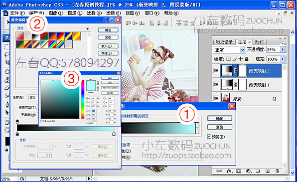 二、再创建渐变映射调整图层,鼠标点击图1处,悬着灰色渐变图2, 图3颜色:#adfeff,确定后把图层不透明度改为:24%,如下图。