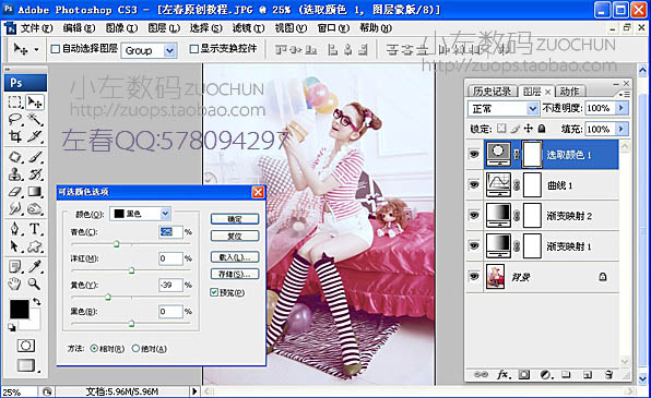 四、创建可选颜色调整图层,选择黑色数值:青色-25%,黄色-39。