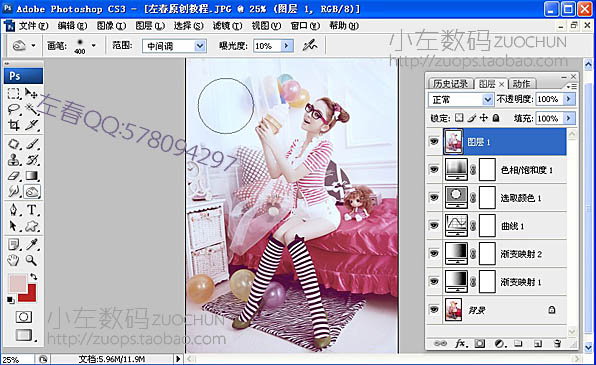 六、合并图层!用加深工具(范围:中间调,曝光度10%)把四周过亮部位压暗!再修饰人物,适当液化。最后锐化,完成最终效果。