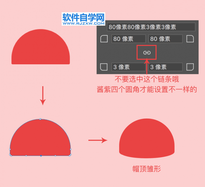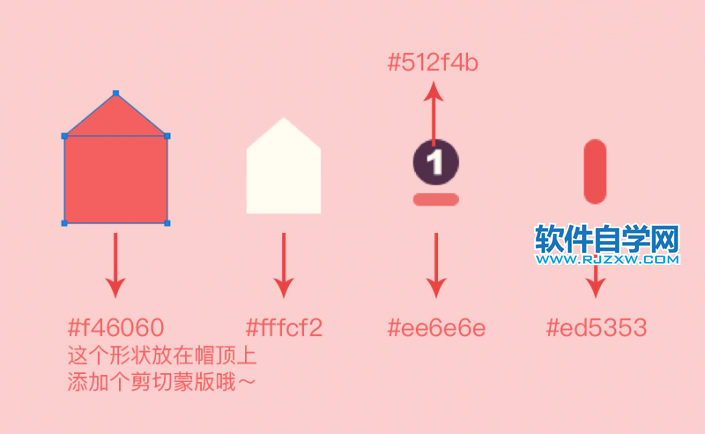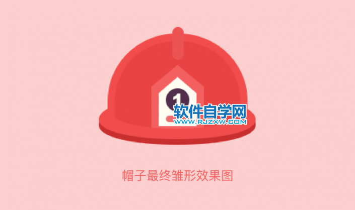 1、首先新建一个1200*900的画布,油漆桶填充背景色#fccfcf。先做帽子部分,绘制一个160*96的矩形,颜色为#e94343,在属性面板里打上四个圆角:80,80,3,3。