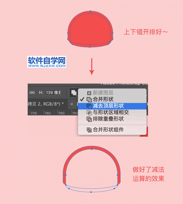4、再来做帽子的装饰条。将帽顶的形状复制两层,上下错位摆开上面的那一层单独选中后缩小一点,然后同时选中两个形状后Ctrl+E合并形状。合并完了后再单独选中顶层形状,点击操作栏里的减去顶层形状;然后点击合并形状组件。