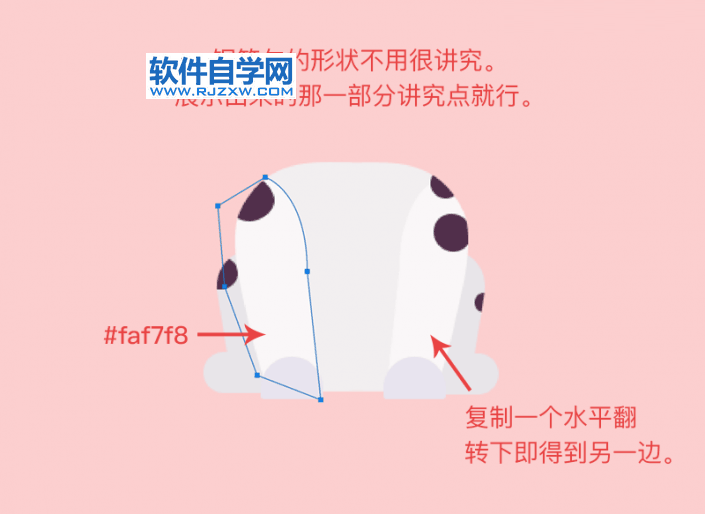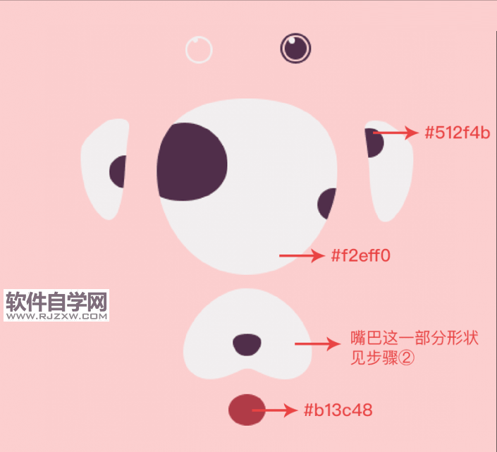 眼睛以及斑点的色值为#512f4b,舌头的色值为#b13c48,主体浅色部分色值为#f2eff0。