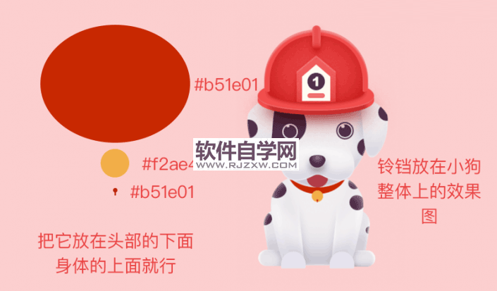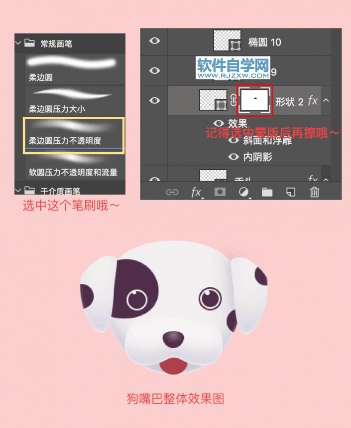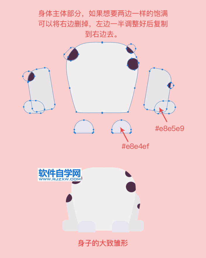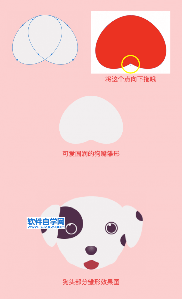 12、头部分的拆分图如下:狗头主体部分是正圆调整了锚点后得到的,耳朵部分可以由圆变形,也可以用钢笔勾得到。