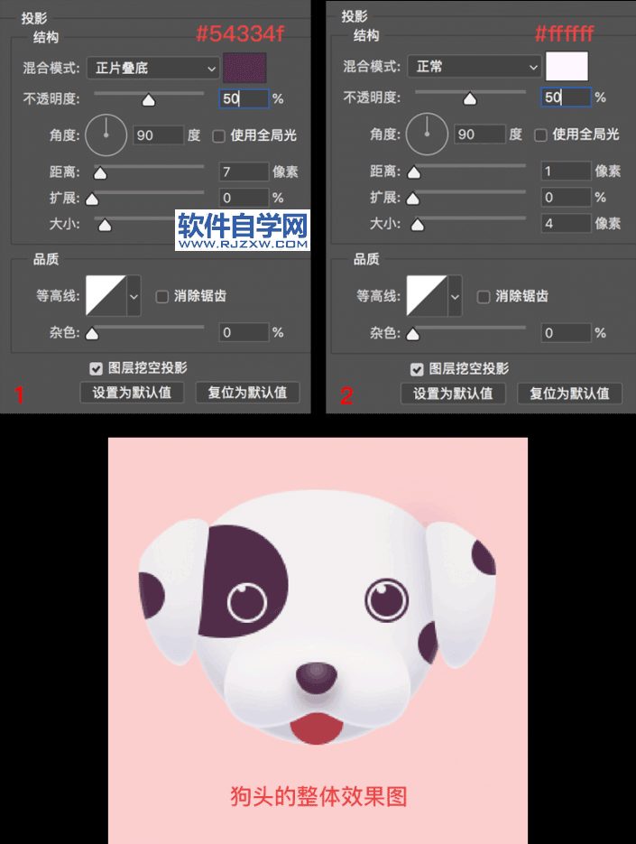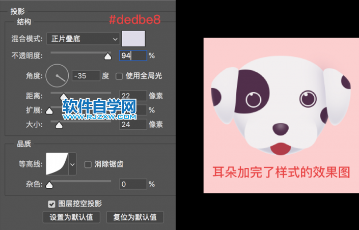 15、选中狗头主体部分图层,右键选择拷贝图层样式,然后选中右耳图层右击选择粘贴图层样式。再给右耳加个投影,以下是展示右耳投影的图层样式,左耳的话,将投影角度翻转180度就行了。