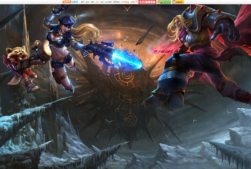3、为了保证画面平衡,四周人设动作造型基本保持对称是一个比较稳妥的方法,所以选择了这3个人设出于他们的动作考虑。左侧用了女枪和浣熊2个角色是因为她们比较瘦小,为了和右侧男骑士壮汉保持一个画面平衡。