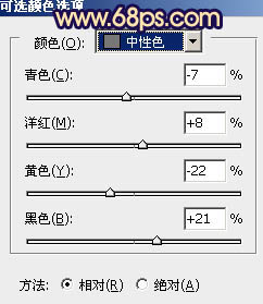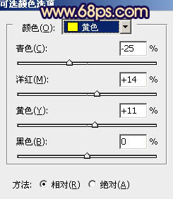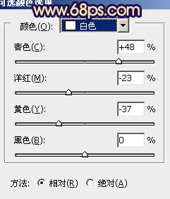 二、创建可选颜色调整图层,对黄、蓝、白、中性、黑色进行调整,参数设置如图2 - 6,确定后用黑色画笔把人物部分擦出来,效果如图7。这一步把背景的暗部转为蓝色,黄色部分转为橙黄色。
