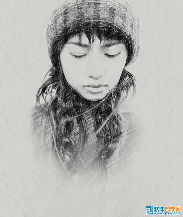 | 12、使用大量的交叉排线重叠地画。请注意,这里不需要实际的素描技巧,我们涂抹只是为了显示蒙板下的图像。 13、可用键盘的“[”和“]”来控制笔刷大小,继续在蒙版上涂抹,记住要保持松散的笔触,围绕面部特点来涂出色调。在头发上,可以使用大尺寸的画笔,使笔触更加的简略。 14、最后,把画笔适当调小,用完全不透明的白色,在蒙板上涂鸦最有特色的地方,为这幅素描带来一些有感觉的黑色笔触。 最终效果: |