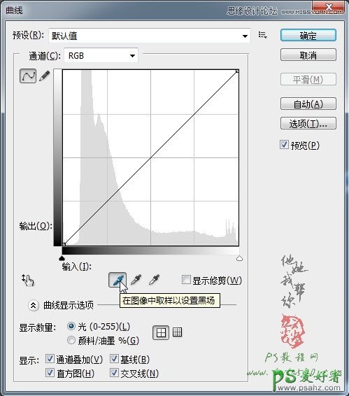 2、在对人物进行抠图之前,一定要仔细分析,不同的图像要用不同的方法,没有哪一种方法是万能的,所以要多练习才能灵活应用,本例中,人物头像的背景主体是黑色,但不纯,背后有一些灰白色的物件,而头发飘起的较多,且颜色多为染色,有黑有黄有灰,这就给抠图带来较大难度,但无论如何,先将背景处理干净一般都是首要步骤,接下来我们就来处理一下背景,确保“背景 副本”被选中,选择菜单“图像->调整->曲线”或按Ctrl+M快捷键,在弹出的曲线窗口中单击“在图像中取样以设置黑场”,如下图所示: