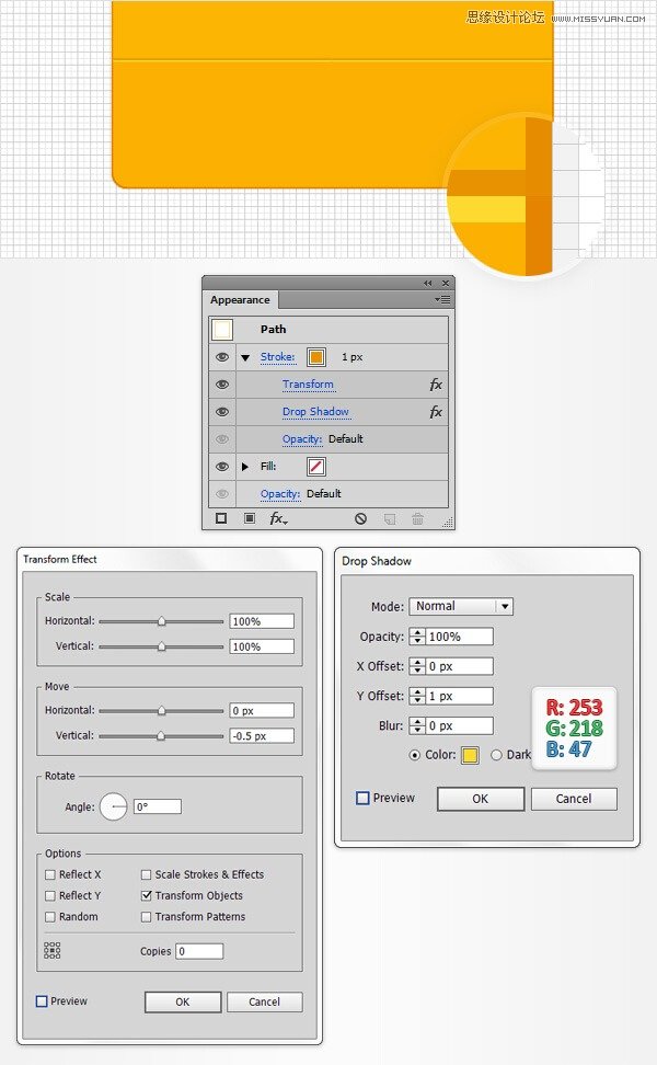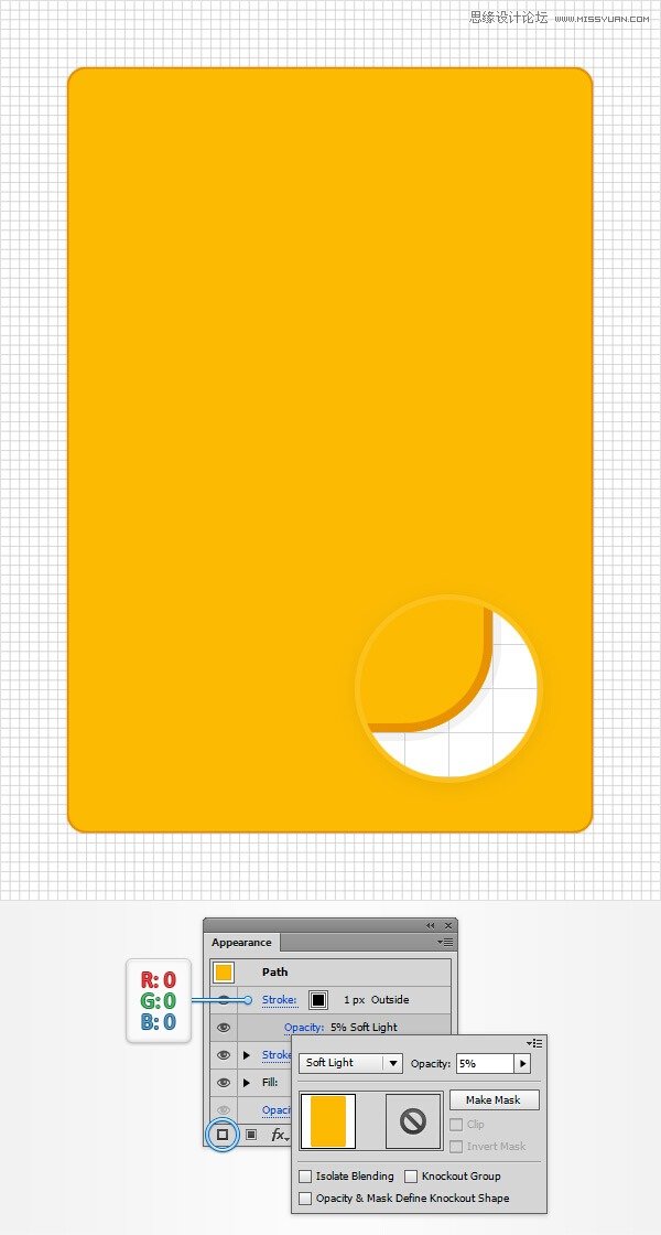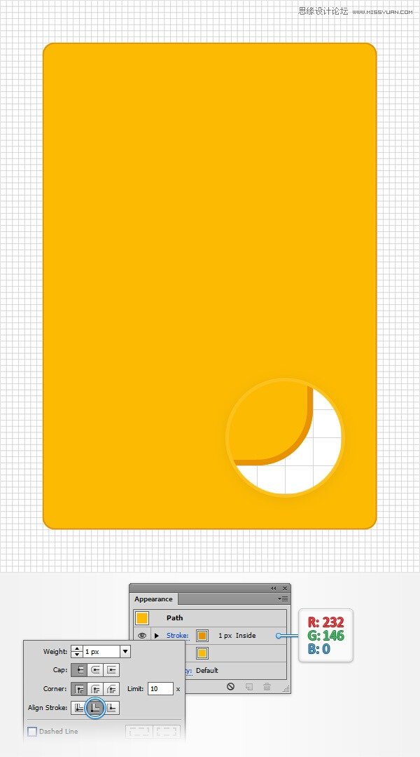 ③ 确保你的圆角矩形保持被选中,注意看外观面板(窗口—外观),选择描边,并设置颜色R=232 G=146 B=0。然后点击“描边”文字,弹出菜单,将粗细设置为1像素,并检查对齐描边内侧按钮。