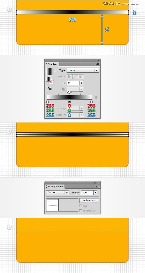 打开渐变面板(窗口>渐变),然后点击渐变缩略图默认的黑色到白色的线性渐变。保持你的矩形被选中,然后注意看渐变面板。设置角度为0度,然后选择黑色的渐变滑块,然后换上白色(R =255 G =255 B =255)。此时注意渐变条,点击它来添加一个新的渐变滑块。选择这个新的滑块,设置它的颜色为黑色,集中在位置框中(从渐变面板),并将其设置为50%。