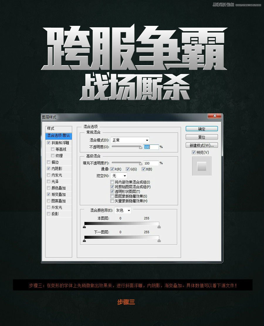 本主要使用制作金属质感的游戏主题艺术字,教程的效果主要是通过图层样式来完成,这个效果在一些游戏网页的专题和专题中非常的常见,今天作者就带着我们一起来解析这种效果的做法,如果不懂的朋友可以下载PSD源文件来完成,喜欢的朋友一起来学习吧。