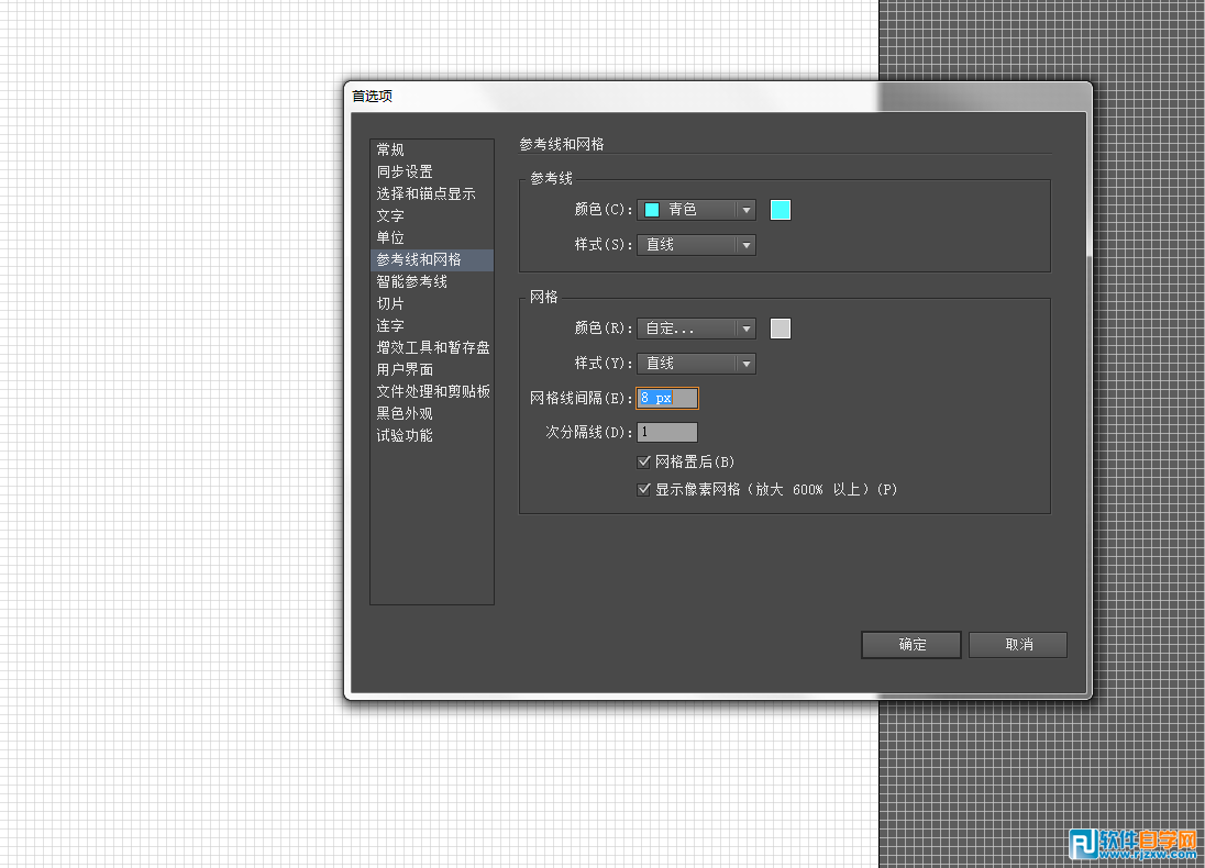 因此,新建后的文档,选择【视图>显示网格】以及【对齐网格】,在【编辑>首选项>参考线和网格】中“网格线间隔”就可以设置为8px,其他可参考我所提供的设置参数。