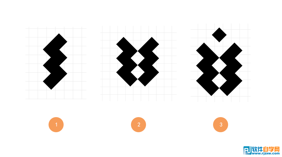先画出三个矩形,将矩形旋转-45°,排列出下图1的样式。将这三个矩形编组,编组后再复制,将复制后的形状对称到左边,形成如下图2的样式。将这个图形编组后,在顶部增加一个矩形,旋转45°,然后将这两个形状正中对齐。再将其编组。