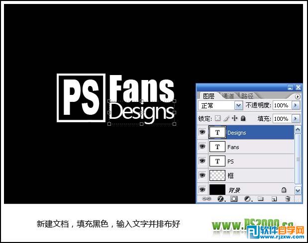 | 1、新建一个600 * 400 像素文件,背景填充黑色,然后打上白色文字,如下图。 |