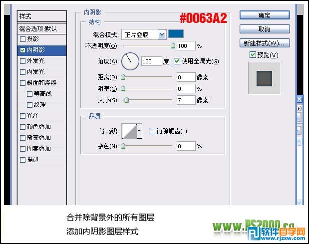 | 2、合并除背景外的所有图层,然后对合并图层执行:图层 > 图层样式 > 内阴影,参数设置如下图。 |