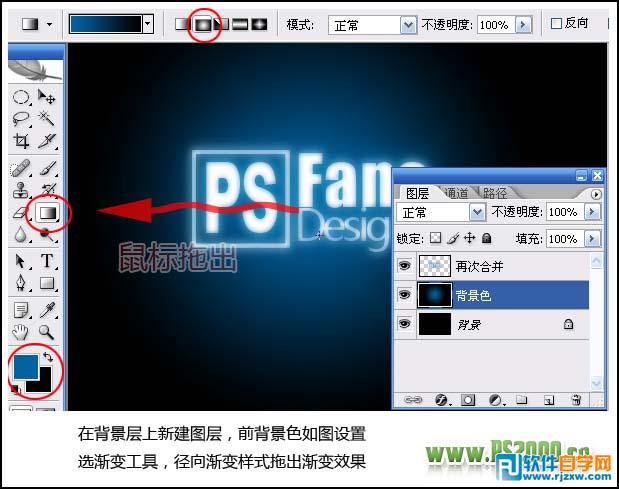 | 5、在背景层上新建图层,前背景色设置如下图,然后选择渐变工具,拉出下图所示的径向渐变。 |