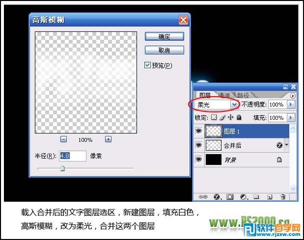 | 4、载入合并后的文字图层选区,新建一个图层填充白色,取消选区后,执行:滤镜 > 模糊 > 高斯模糊,参数设置如下图,确定后把图层混合模式改为“柔光”,然后合并这两个图层。 |