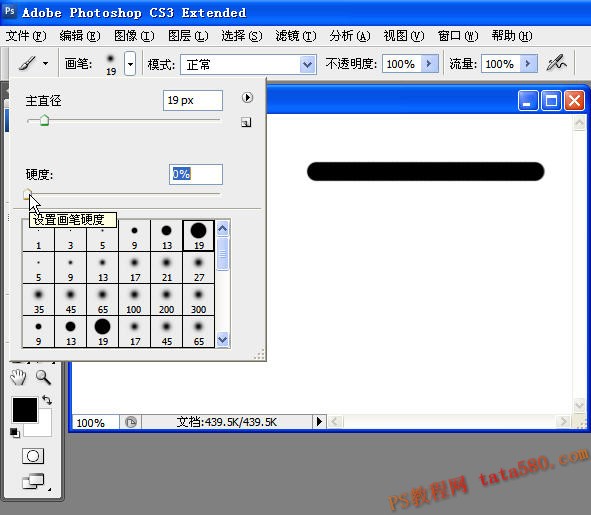 3、当画笔的硬度为100%时,画出的效果如下图所示,之后我们将硬度调整为0%,如下图所示: