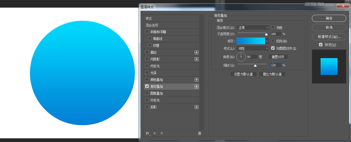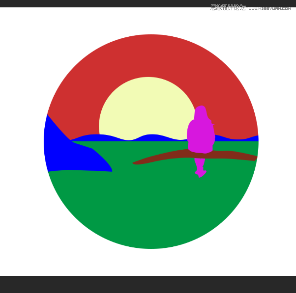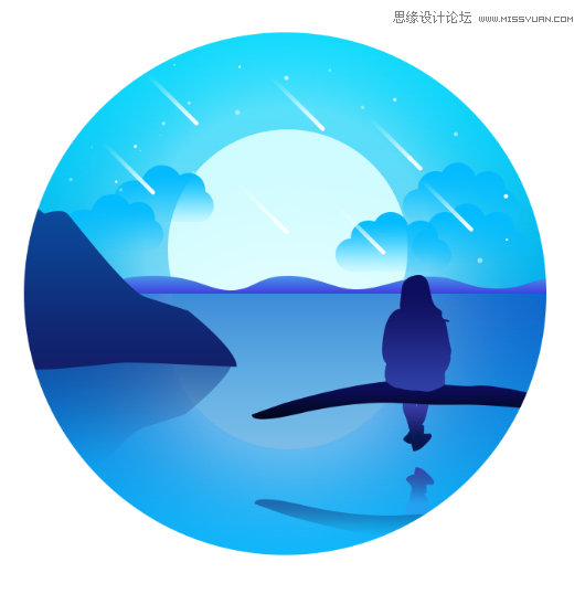 底层圆形填色:给底层的圆形一个渐变叠加,这里不输入代码,根据色彩感觉自行配色即可,网上教程大多为叫深邃的颜色,彰显孤单寂静的美感,可以去参考一下,这里我个人比较喜欢纯色,所以相比其他的插画提高了饱和度和明度。