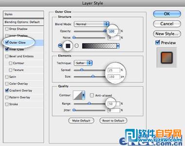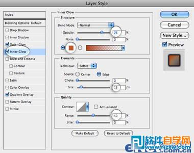 | 4、在黄色椭圆图层调出图层样式,并如下设置。 |