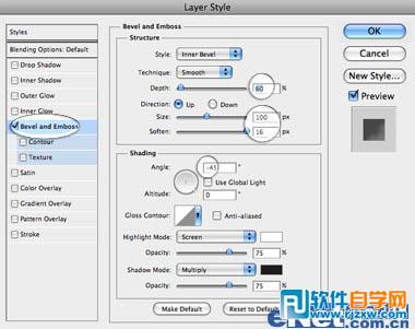 | 5、选择黑色椭圆,并调出"斜面与浮雕"如下设置。 |
