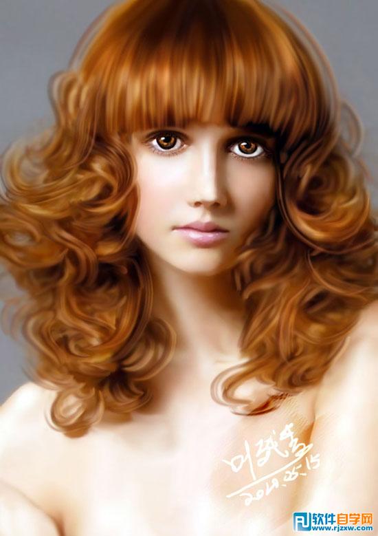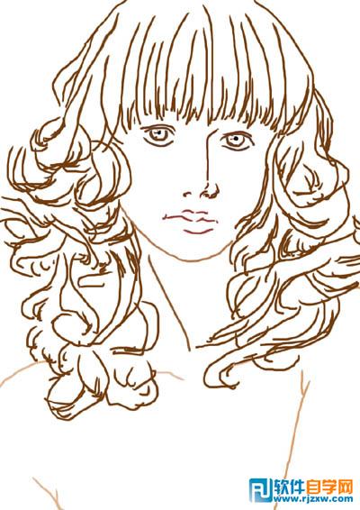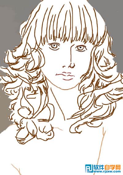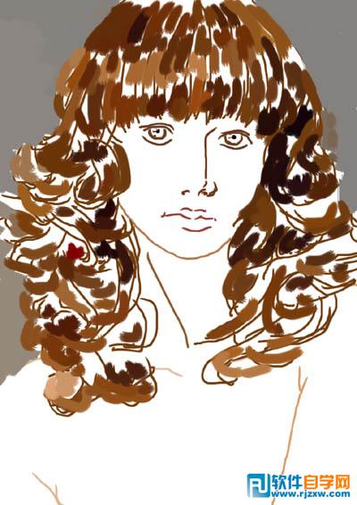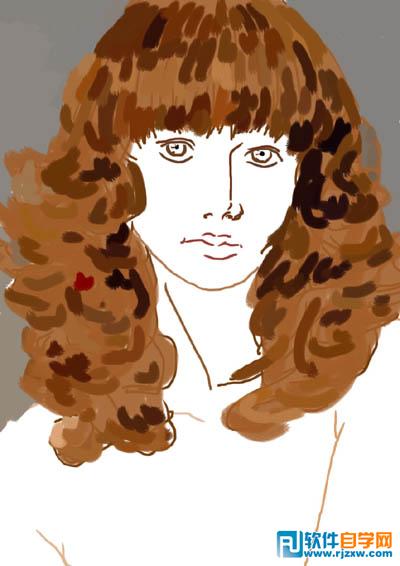 | 3、新建图层,为头发大致上色。把头发和身体的色彩可以分开。多余的部分可以轻易地用橡皮擦去,缺少的部分可以用画笔补上。 上色的时候在色板上多选几次,让颜色更加丰富。如果需要相同和相近的色彩,直接用滴管工具吸之。 |