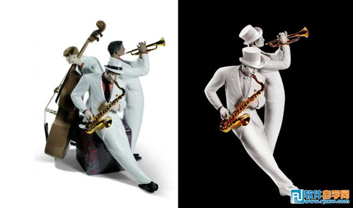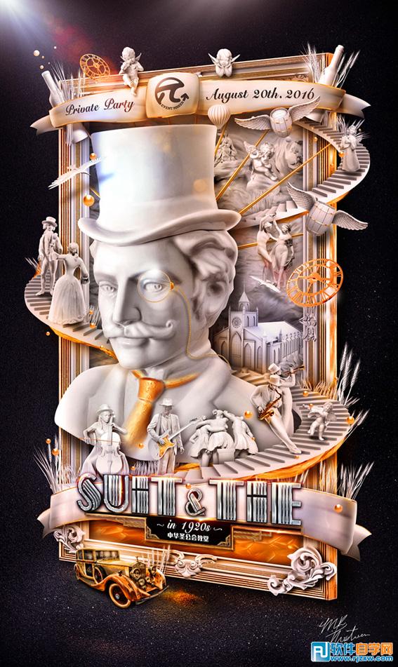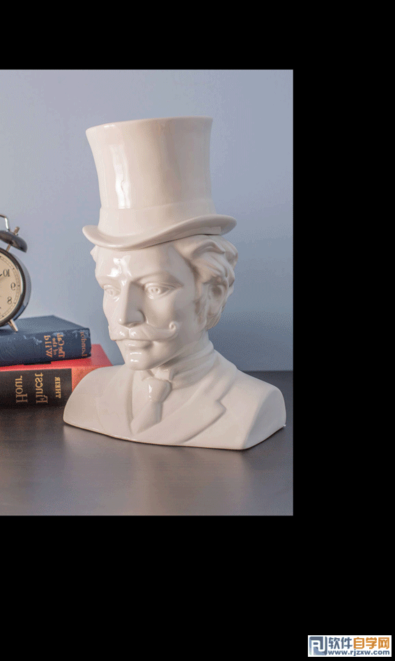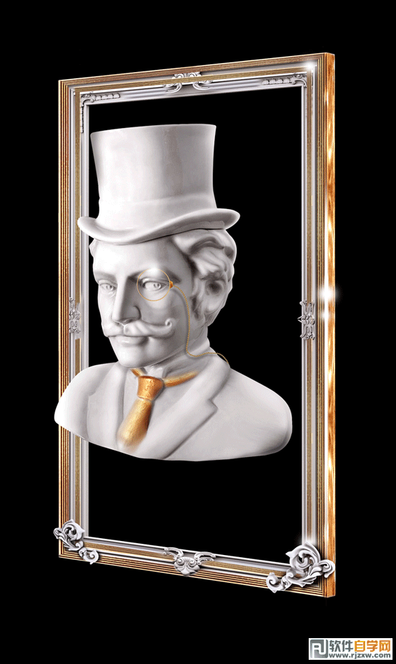 | 二、人像 这个人像是我在百度上面找到的小石膏像图片。石膏像要经过PS磨皮去反光,并加强对比度。眼球的位置调整,看向镜头。领带贴上金色,眼镜的制作。 |