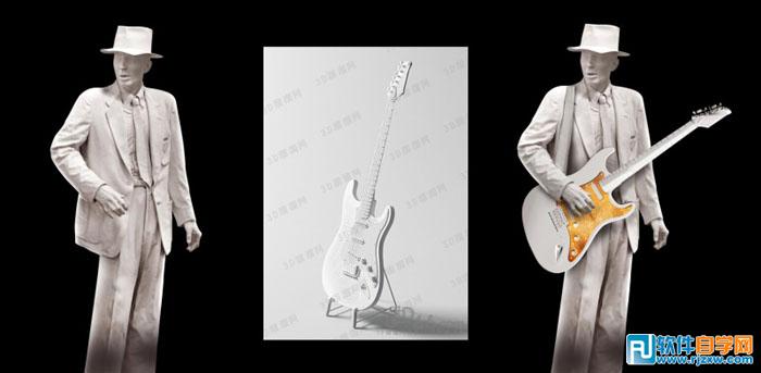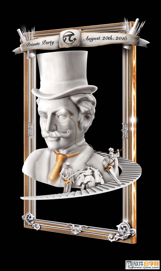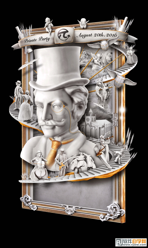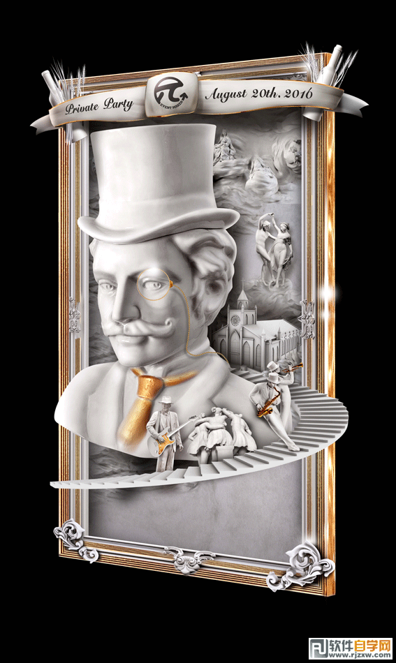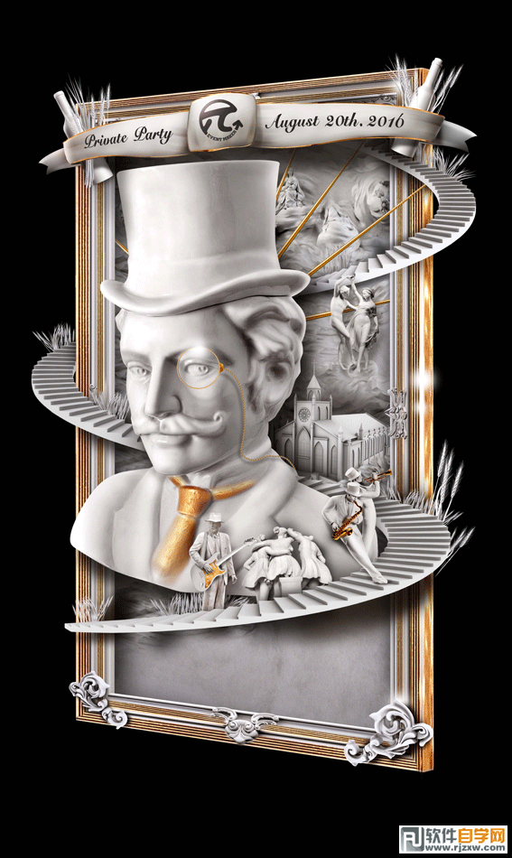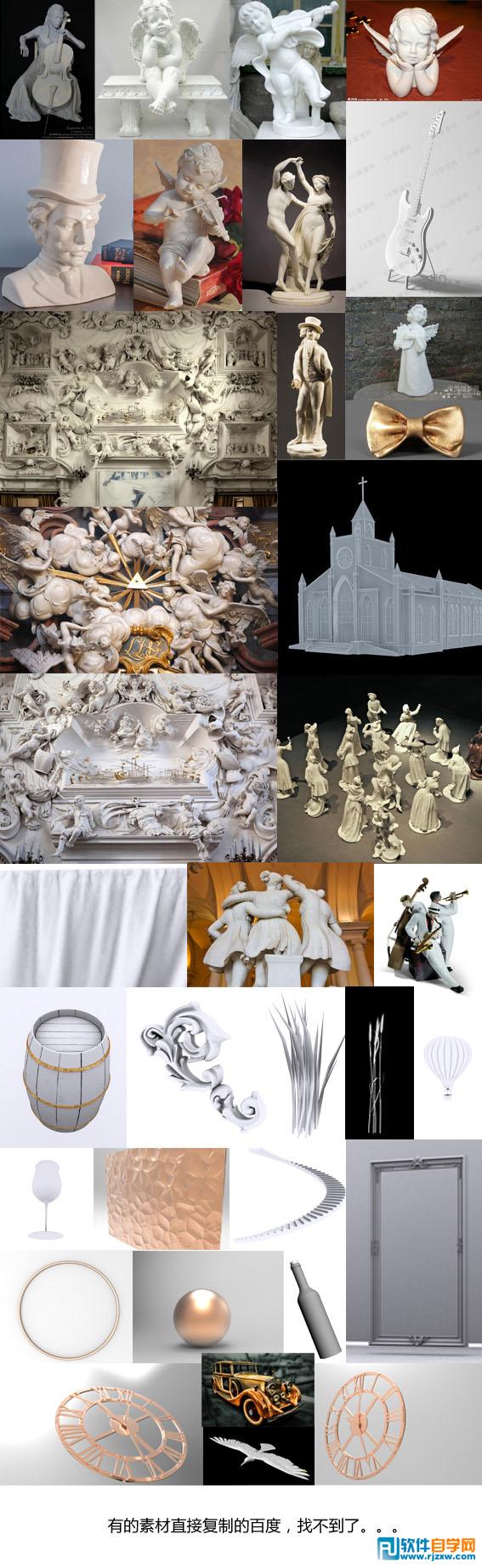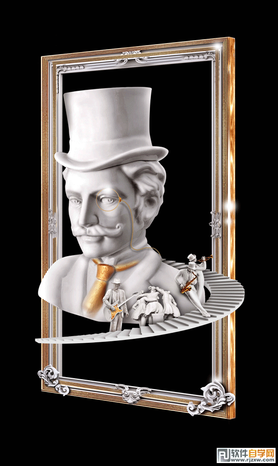 | 三、人像+边框+楼梯+人物细节 楼梯是我用不熟练的三维软件弄的。上面的小人,可百度各种石膏人像,然后进行改造!(如下图例子)。 |