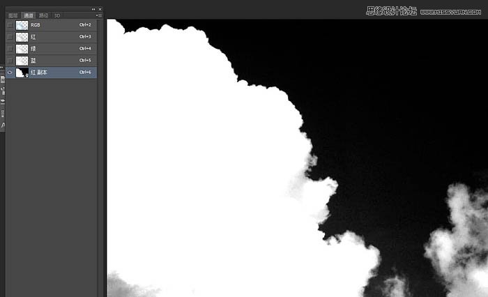 2、云朵抠图(这里要注意了。我们要得到那种实心的大云朵,而不是虚虚散散的浮云。同样在红色里面抠出,不过,如通道所示,我们要扣实心,即把云和天分离,较为明确的分离。