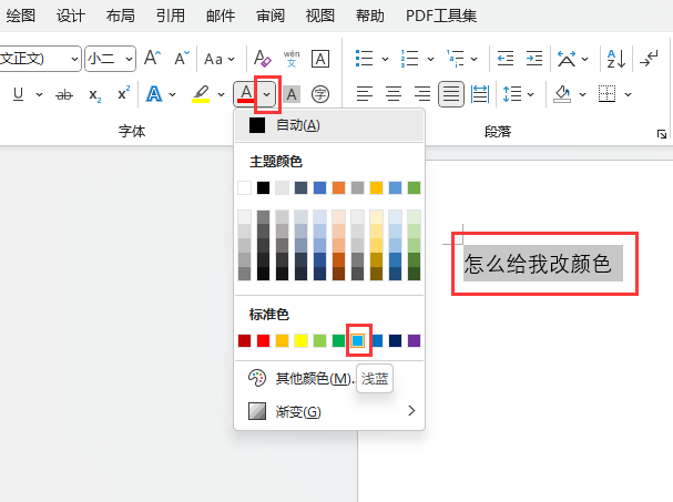 Word2021怎么把内容设置为别的颜色 日期:2025-10-21 17:08:19 栏目:软件教程 浏览:18 评论:0 1、打开word2021软件,新建空白文档。 2、选择内容对象,点击开始菜单,点击字体颜色设置。 3、点击颜色里面的蓝色。效果如下: 4、这样内容设置好了蓝色。效果如下: 上一篇:chatgpt代写文章 下一篇:word文档由竖向变成横向的方法 相关推荐 CDRX6绘制漂亮有图案的雨伞 chatgpt网页版登录流程 Illustrator简单绘制金色指南针 手机充电器可以混用吗详情 评论留言 我要留言 ◎欢迎参与讨论,请在这里发表您的看法、交流您的观点。 昵称:* 邮箱:* 网址: 内容: 取消回复