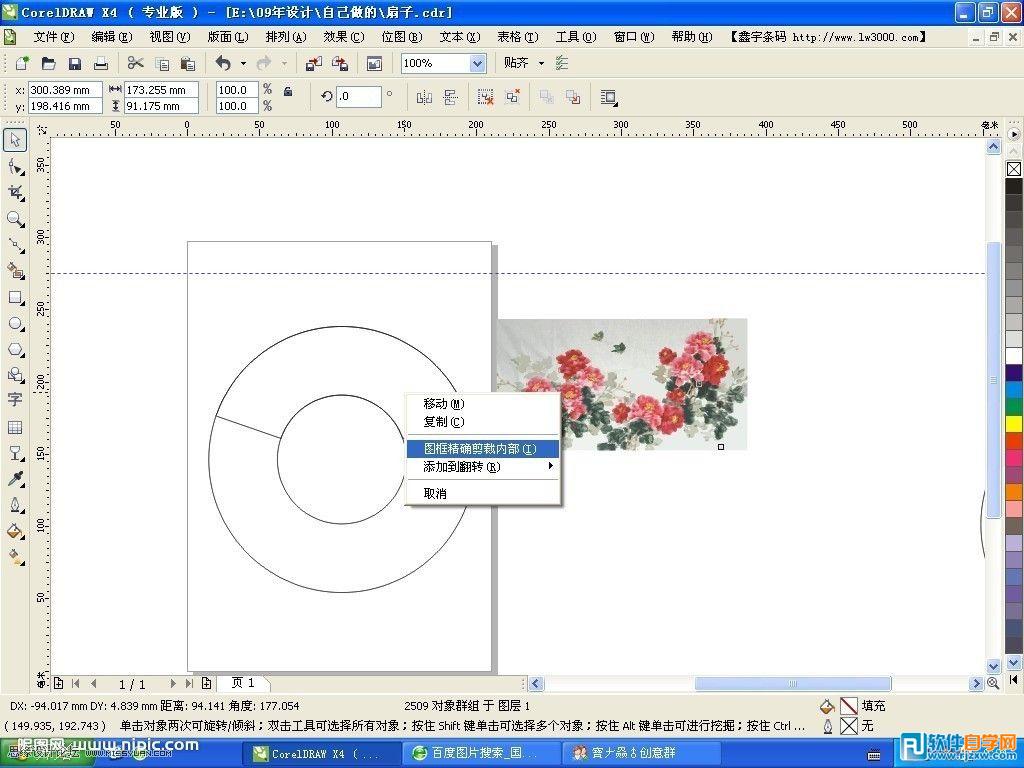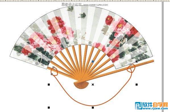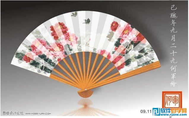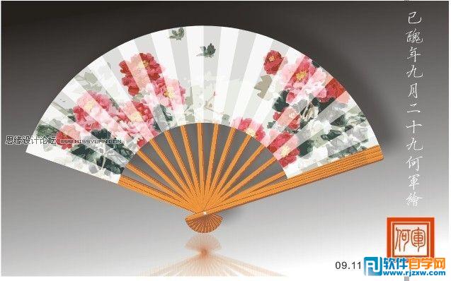 2.扇面上的画,折扇似呼是古代文人骚客的必备物件,自然上面都是书画佳作,所以我们最好准备一张国画,或者书法作品。置于扇面中,如图: