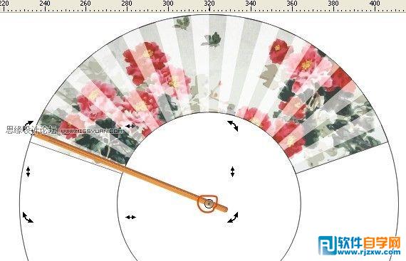 3.接下画就处理折扇手有的折熠,如图画一个等腰三角形,三角形的顶点要怡好在圆环的中心点,底边与扇边重合,