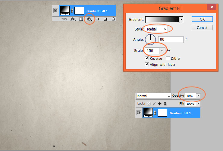 5、点击下图所圈出的,或点击 图层→新建填充图层→渐变。将样式设置为径向,可以更好地塑造复古的感觉。