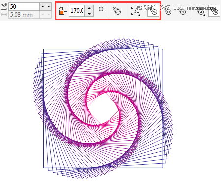 在属性栏中,调整其步数为50,设置调和旋转角度为170度,选择直接调和,设置好这些属性之后,呈现效果如图所。