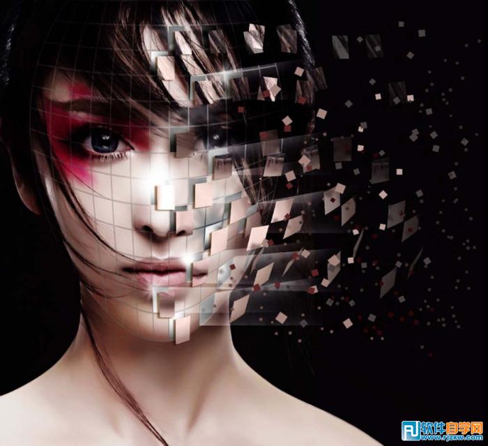 | 这里我尝试了散点光源!大致如图;其实我们也可以反过来思考,人物背后无光源,人物本身是光源,破碎出来的皮肤边缘发光,以及格子线上有细碎的光,这样人物形象会更像机器人了,镂空处还可以处理上机器的内部结构,如钢管、螺丝、齿轮…………。 最后,我们需要调整下剥离下来的皮肤,因为分布均匀,失去了活力,适当旋转下试试看!大家可以自行调整,加上投影,然后网上下载些碎片的笔刷,控制下散点画笔,给画面增加些许细碎的线索,就这样完成了!是不是很好看呢!的确挺花时间的… |