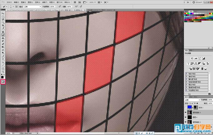 | 4、这里一定有人会问:“为什么不使用魔术棒工具做出快速的选择”,当然你可以尝试,经过我的实验,魔术棒工具选择近似的色彩范围,很容易选择超出某固定格子范围,造成选择操作的困扰!个人认为,使用“以快速蒙板模式编辑”最为方便实用。放大绘制会比较方便。 完成后,点击“以快速蒙板模式编辑”,恢复到正常模式了,原红色区域变为选区,按 Ctrl x,剪切,新建图层 Ctrl v 粘贴,移动回原来位置,并隐藏格子图层。给刚刚粘贴的图层添加投影,双击图层,添加投影式样,如图。 |