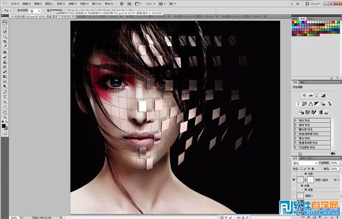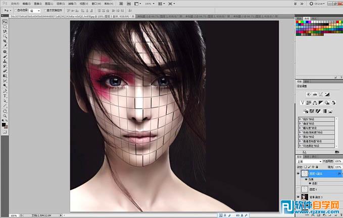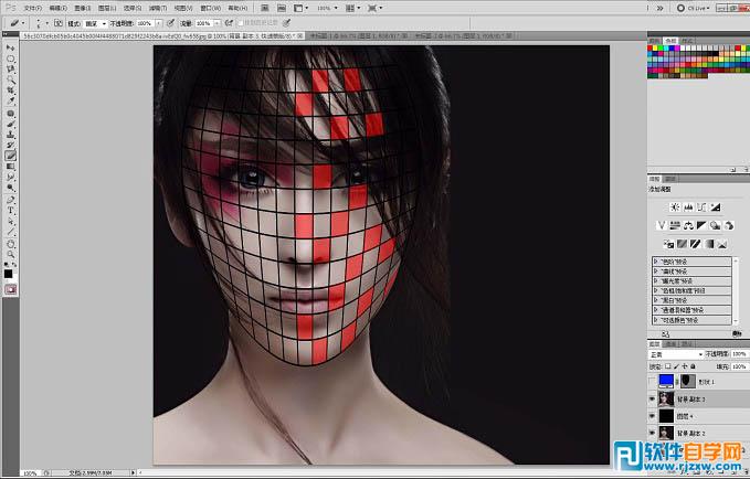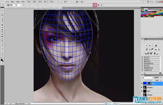 | 2、将AI中的格子素材置入 Photoshop,控制缩放适合的大小,然后观察,由于人脸是立体的空间结构,故而格子的表现理所当然应该是体现出人脸的立体空间,适当的调整格子的编制,快捷键 Ctrl T,控制完成大体的范围之后,点击变形模式,扭转格子曲线贴合人物脸部轮廓,这一步需要耐心与细致,尽量完美贴合。 友情提示:这里纯正面人物,相对容易制作,若是其他角度,个人建议:把图片置入AI 中操作好格子之后再转入PS执行后期步骤。 |