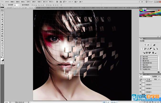 | 5、然后移动图层位置,复制图层,继续……,降低后几层透明度模拟出空间感,做到这里 大致的感觉出现了,然后继续丰肉,让画面更丰富,我们把被抠掉的部分皮肤镂镂空,调出刚刚的格子选区用以勾掉皮肤。 到这里人物会显得机械化,像机器人似得,画面的灵活性缺乏了,那么怎么丰肉呢!来想象这样的一个画面,人物剥离洋洋洒洒飘散开来,原本被人物挡住的光效从皮肤的分析透出来,散射。对了就是这个感觉! 当然我们大致可以考虑两种效果:1.一个光源 2.散点(多个)光源;当然其他还有很多种可以值得思考的。大家可以尽力尝试!做出你心中的女神!。 |