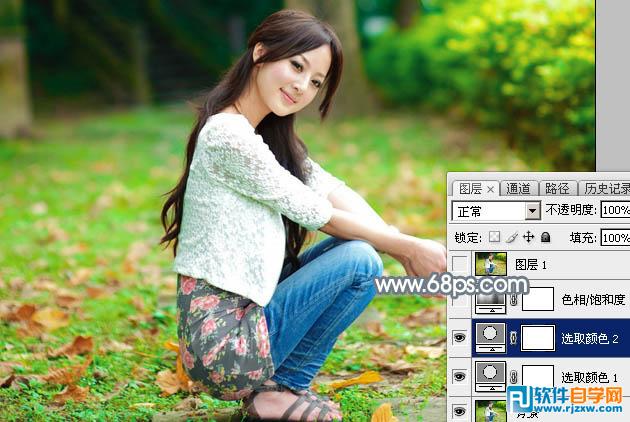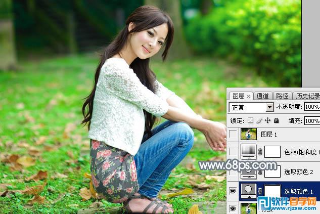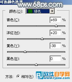 | 1、打开素材图片,创建可选颜色调整图层,对绿色进行调整,参数及效果如下图。这一步先把图片中的绿色加深。 |