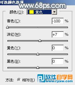 | 2、创建可选颜色调整图层,对黄色进行调整,参数及效果如下图。这一步把背景部分的黄绿色都转为橙黄色。 |