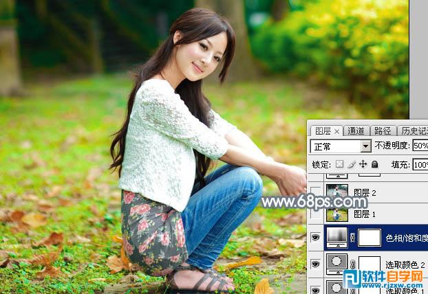 | 3、创建色相/饱和度调整图层,也对黄色进行调整,参数及效果如下图。确定后把图层不透明度改为:50%,效果如图6。这一步给图片增加暖色。 |